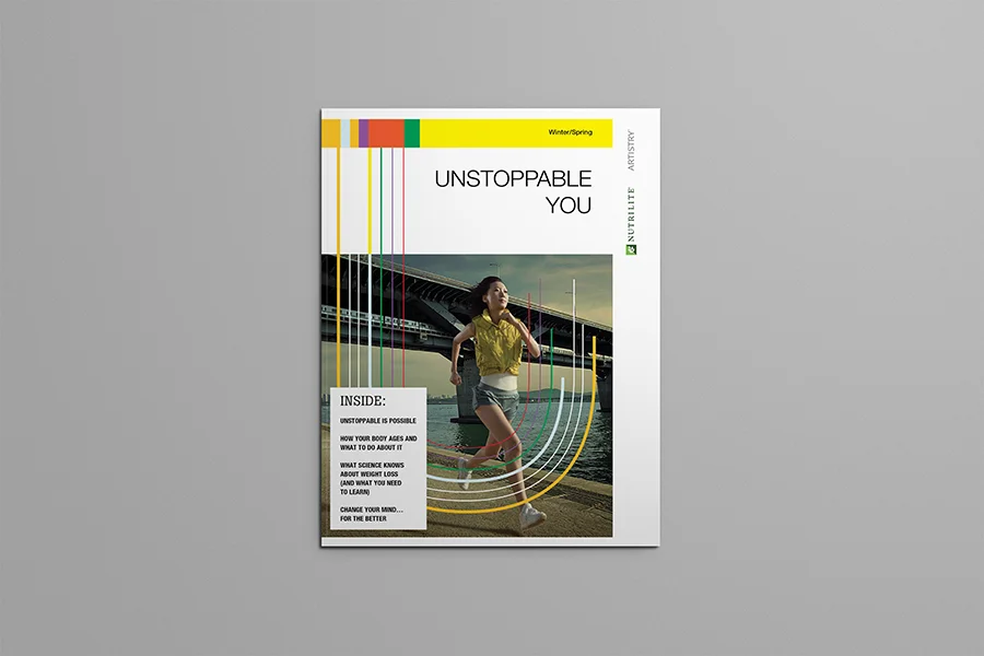 At Kantorwassink, I art directed and designed a direct mail promotional piece for Amway Global called Unstoppable You, which covered everything the company had to offer from vitamins to their Artistry organic makeup line.